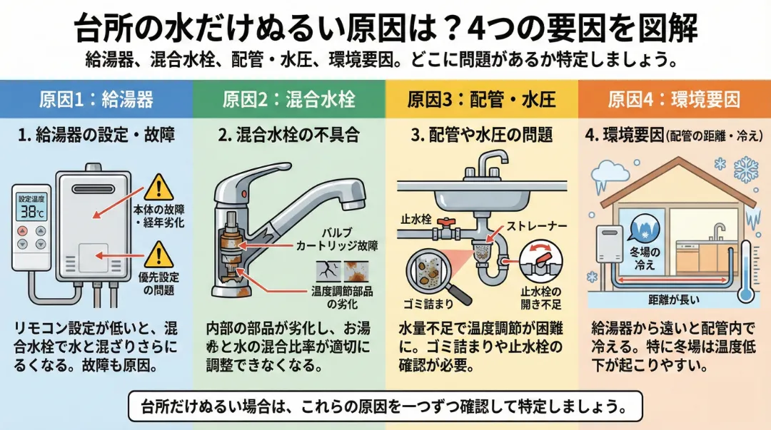 台所の水がぬるい原因は大きく分けて4つあります。給湯器の問題、混合水栓の不具合、配管や水圧の問題、そして環境要因です。まずはどこに問題があるのかを特定することが大切です。