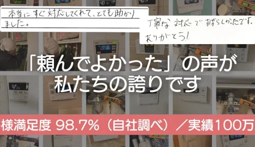 リンナイ・ノーリツ・パロマ・パーパス等のメーカー対応。自社倉庫に常時100台以上在庫し、現地確認後すぐに交換作業開始。