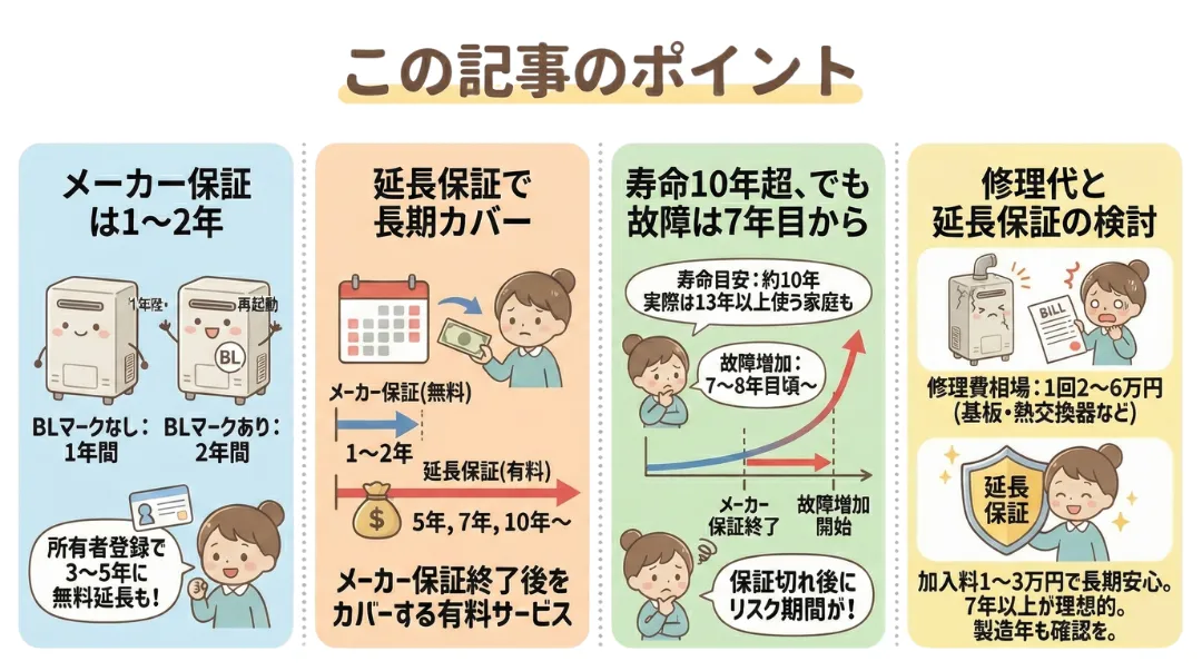 給湯器を購入するとき、「保証は何年ついているのか」「延長保証に入ったほうがいいのか」と迷う方は多いでしょう。